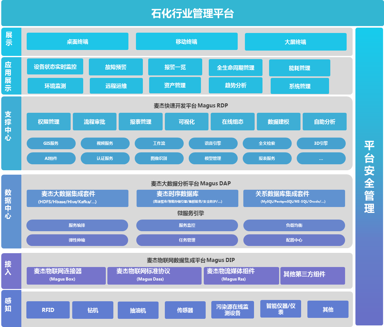通过对设备运行状态、资产信息、环境信息、安全生产信息的集中监控、管理与分析,形成由预警、监测、防护、响应、恢复构成的一体化监管平台,实现终端感知对象多维信息跨地域的全面感知、高度共享。基于物联网与现有应用系统的集成,利用数据挖掘和深度分析,逐步实现智能能源生产管理。